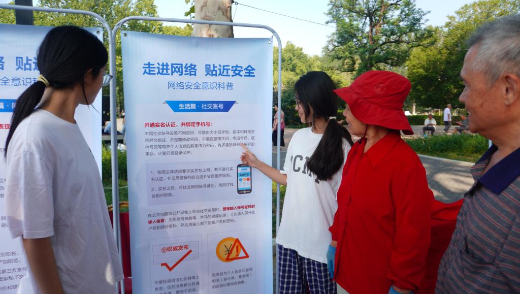 作为国家网络安全宣传周期间的重要实践活动之一,9 月13日,学院组织学生宣讲队走进周村人民公园,开展“护网传声进社区”科普宣讲行动。学生宣讲队在公园广场设立宣讲点,通过展示“生活中的网络安全”主题展板、现场答疑等形式,面向市民普及“防范电信网络诈骗”“老年人安全用网指南”等知识。同时,学生宣讲员主动走近游园的市民,尤其是老年群体,耐心为他们讲解网络安全知识,用通俗语言解答大家的疑问。此次活动不仅让网络安全理念走出校园,更辐射到了更广泛的社会群体,为营造全社会共筑网络安全防线贡献了力量。