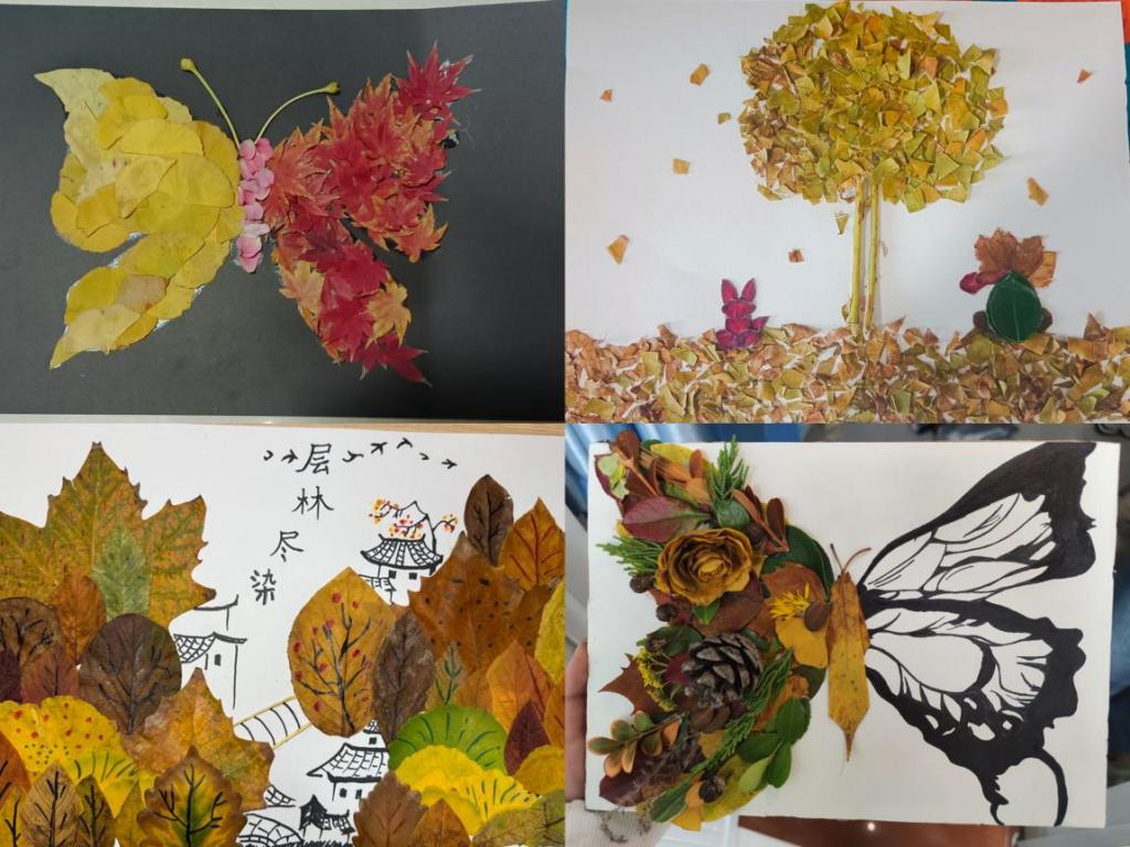 活动期间,同学们走出课堂,在校园林荫道、草坪等地收集梧桐叶、银杏叶、香樟叶、枫叶等。在此过程中,大家卸下学业压力,感受草木生机与四季韧性。创作时,同学们灵感迸发,或以红黄枫叶为底勾勒童话小精灵;或把银杏叶裁成裙摆画芭蕾女孩;或小组合作拼贴林间小路图景。这些作品展现了大家的想象力与动手能力,传递出对生活的热爱,让秋日校园充满创意趣味与治愈力量。